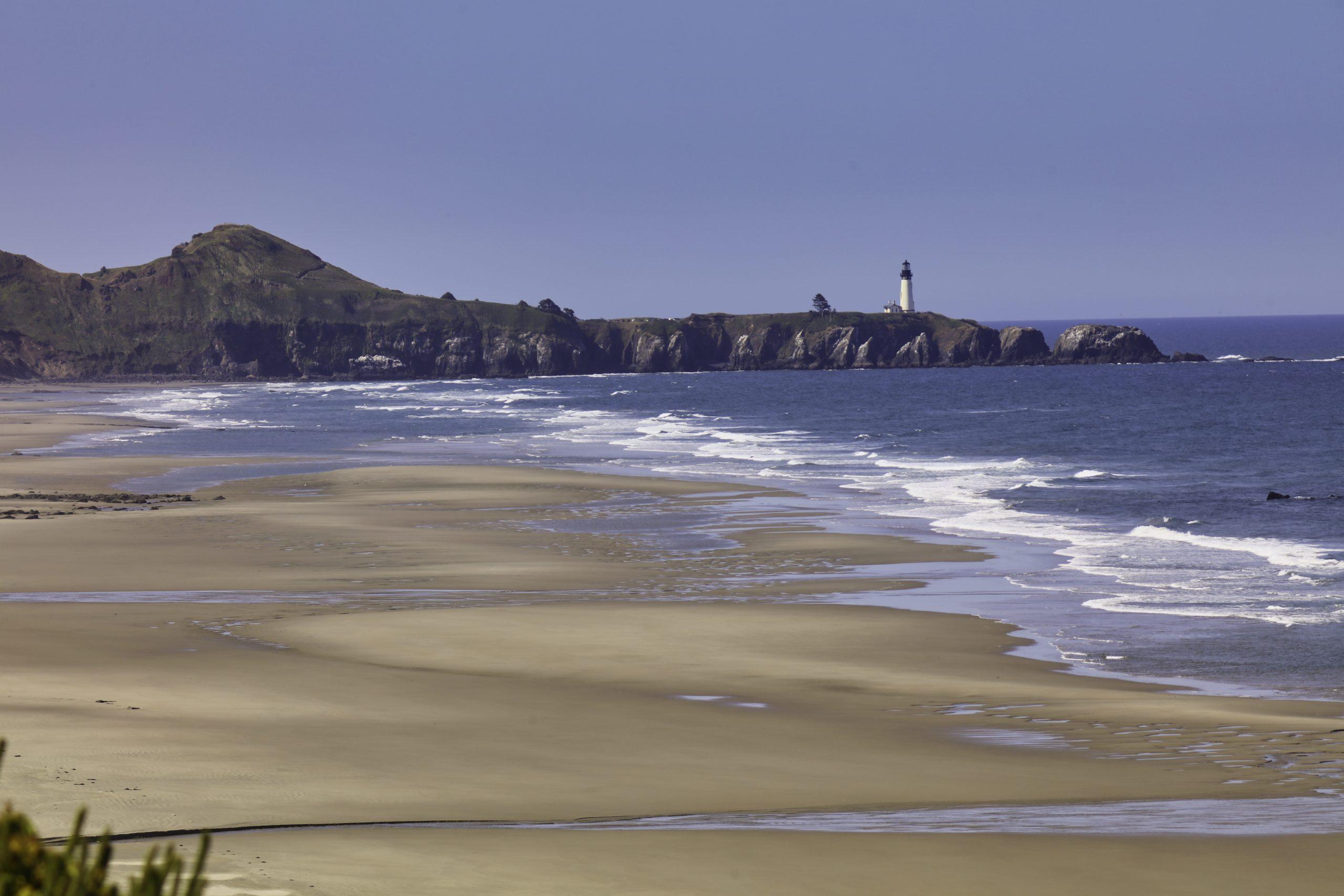 This breathtaking image features a majestic lighthouse standing atop rugged cliffs along the Pacific Northwest coastline, overlooking a vast sandy beach. The serene ocean waves gently lap against the shore, framed by dramatic cliffs and a clear blue sky, capturing the wild beauty of Oregon’s coastal landscape. Perfect for those who adore maritime scenery and nature photography.